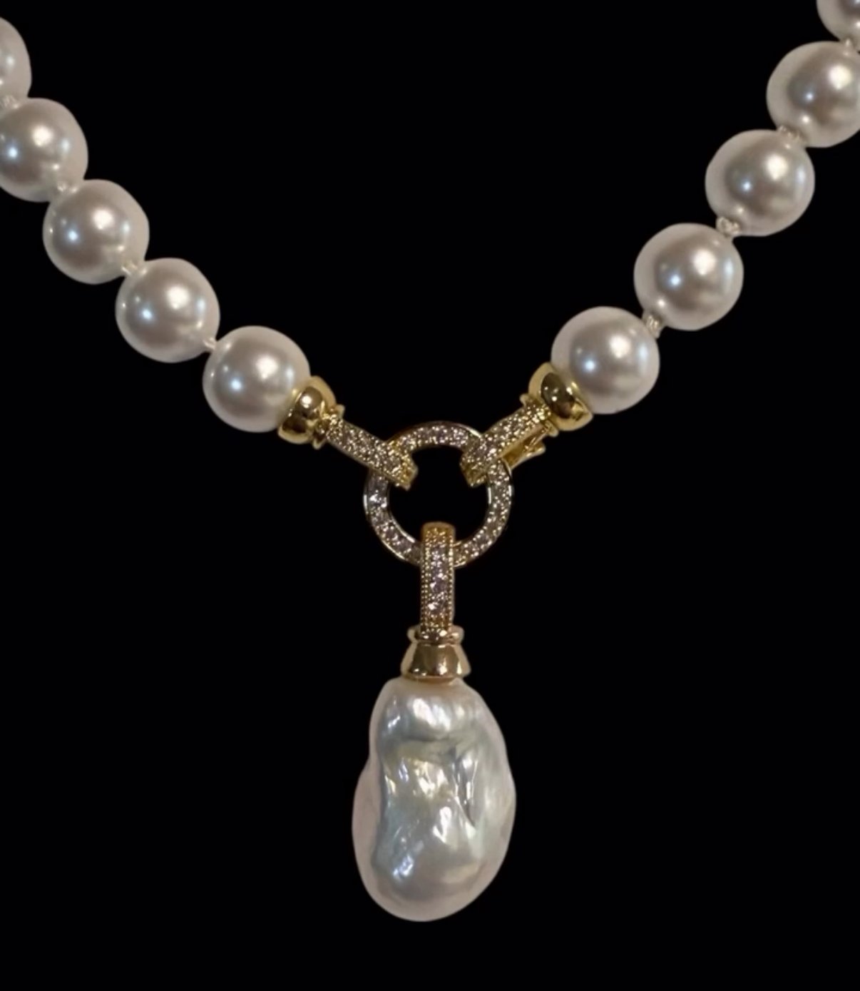 Hand Knotted Glass Pearls with Large Freshwater Baroque Pearl Pendant and 2 smaller round pearls.