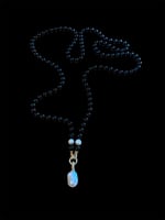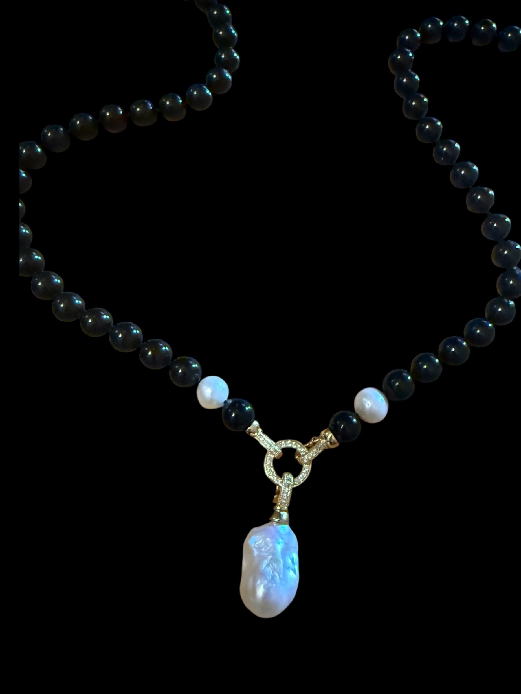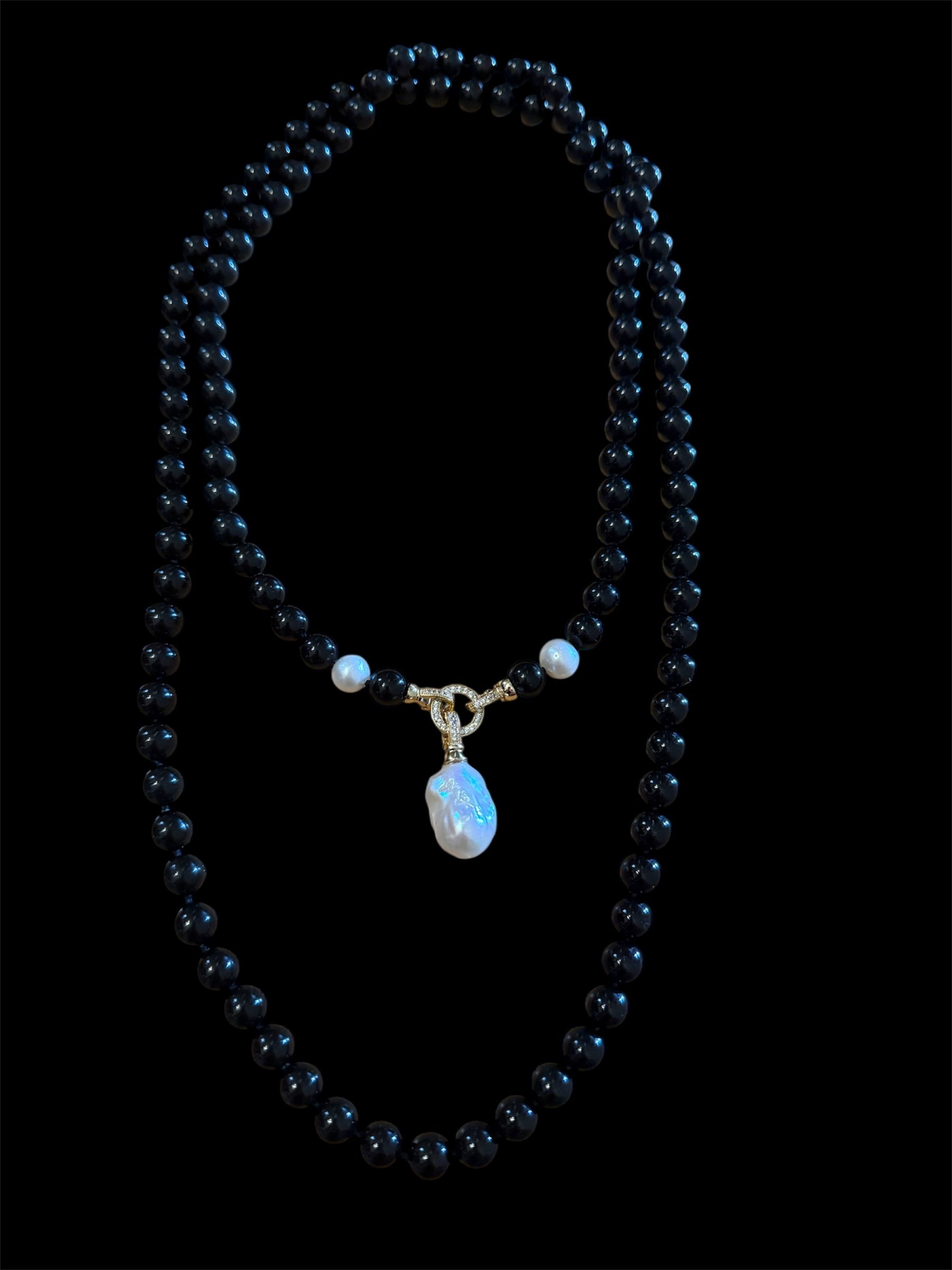 Hand Knotted Onyx Beads with Large Freshwater Baroque Pearl Pendant and 2 smaller round pearls.