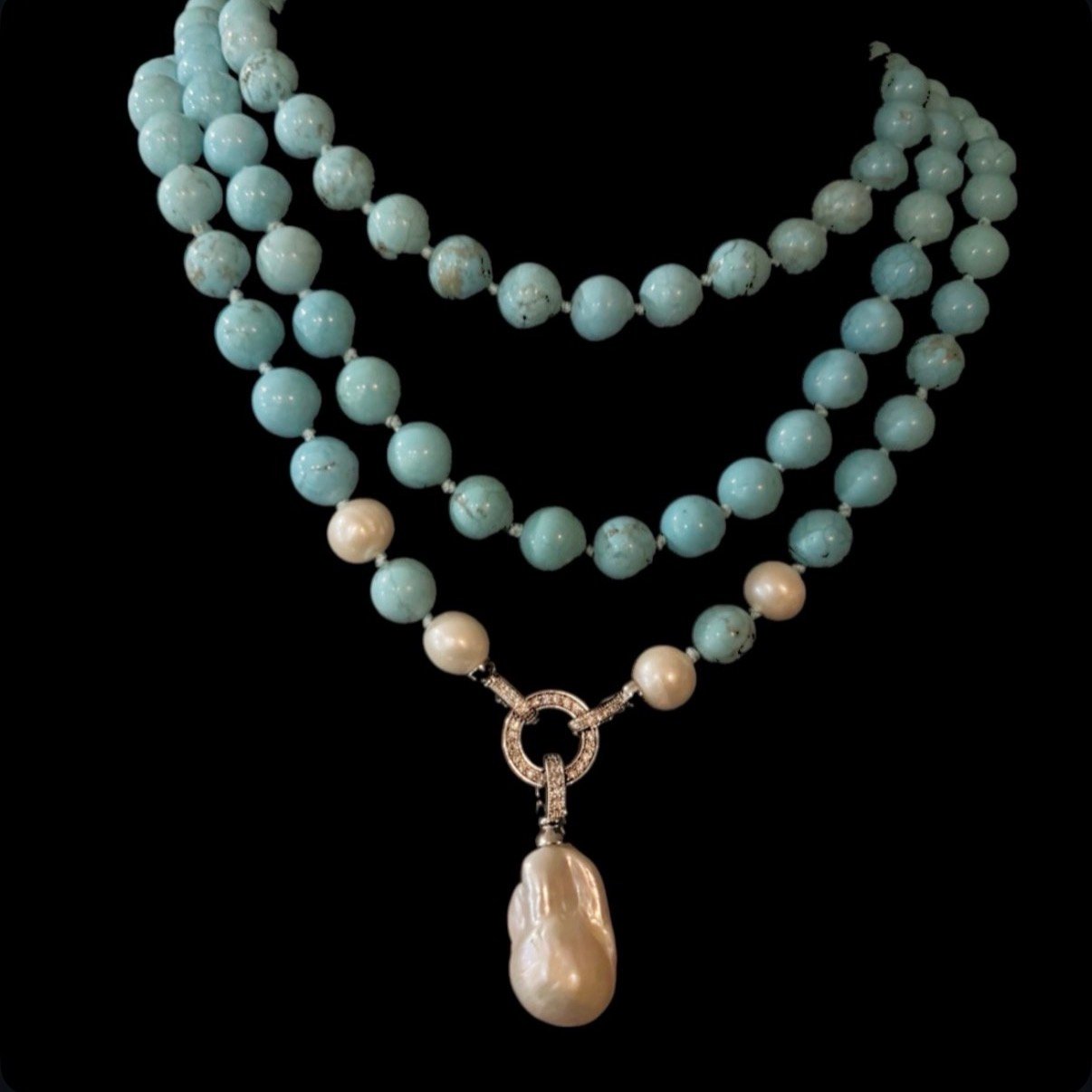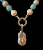Hand Knotted Turquoise Beads with Large Freshwater Baroque Pearl Pendant and 2 smaller round pearls.